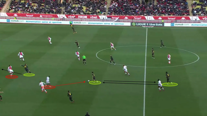 Lors du déplacement à Monaco (3-1) le 11 février : Bitshiabu trouve Vitinha entre les lignes qui peut se retourner. Le Portugais voit ensuite l’appel d’Ekitike qui réclame le ballon dans l’intervalle, mais le milieu mettra le pied sur le ballon, subira la pression de Mohamed Camara, et jouera en retrait.