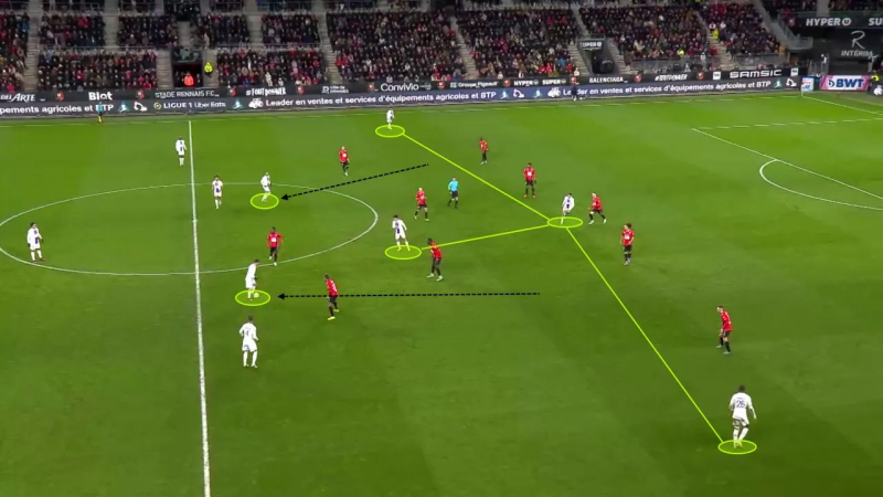 À Rennes (0-1) le 15 janvier : Leo Messi et Neymar décrochent au même moment. Le PSG dispose ainsi de 6 joueurs à hauteur ou derrière le ballon, alors que le bloc rennais composé de 8 pions n’a que 4 Parisiens à surveiller.