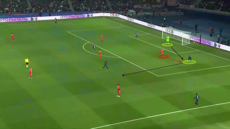 Résultat, le ballon retourne côté gauche, dans la densité, face à un pressing bavarois déjà en place pour enfermer le PSG. Pour le plus grand désarroi de l’Espagnol.