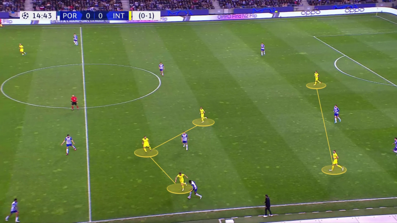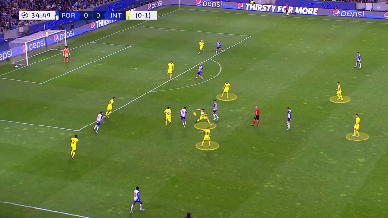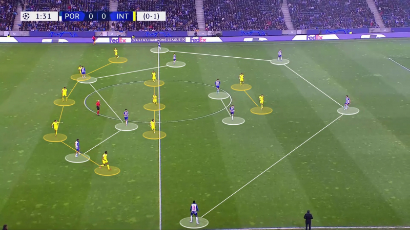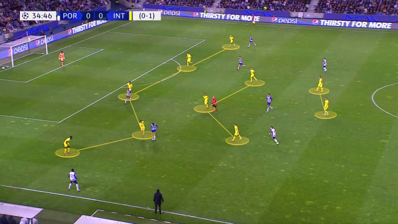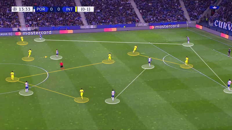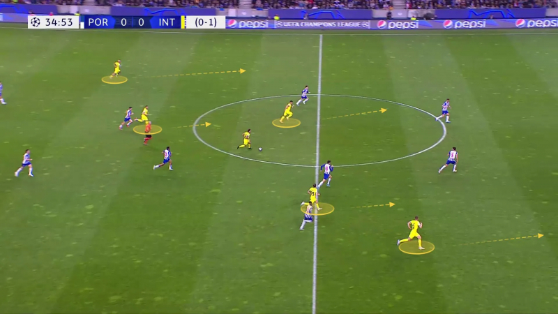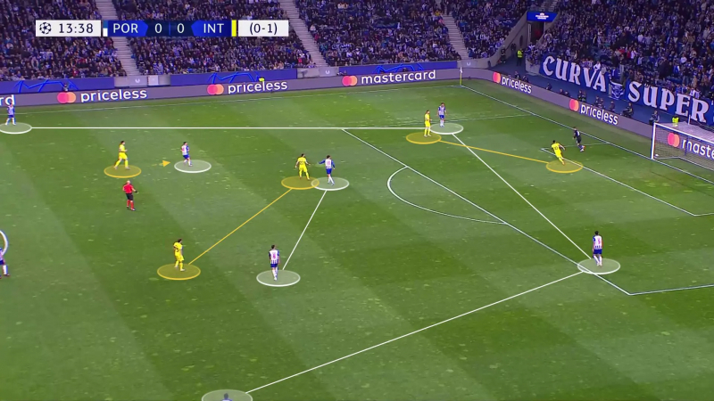 Autre situation douze minutes plus tard : alors que Porto repart court avec Cardoso, Džeko sort sur lui pendant que dans son dos, Bastoni accompagne le décrochage d’Eustaquio…