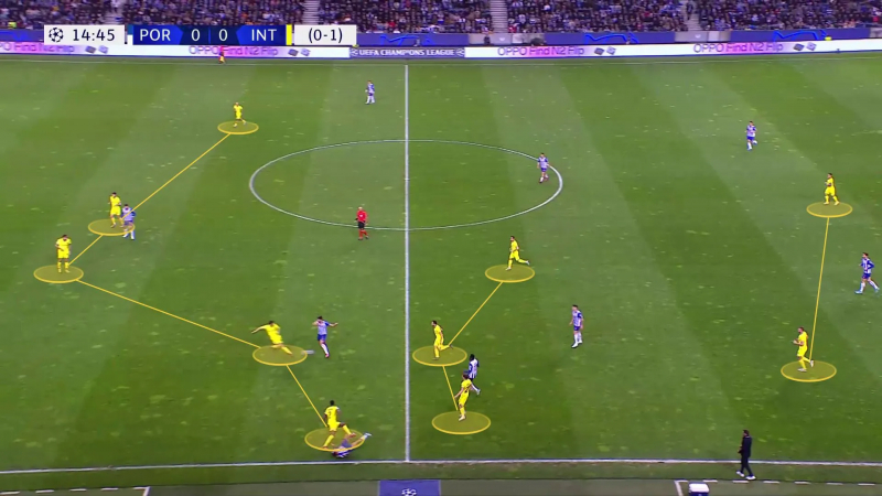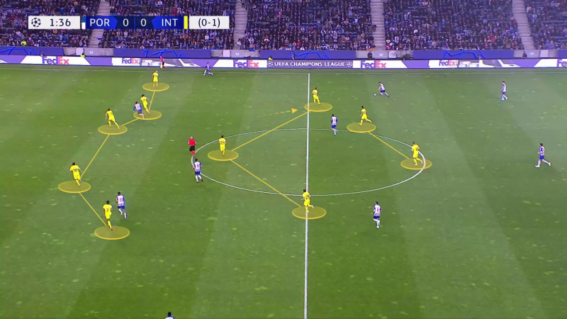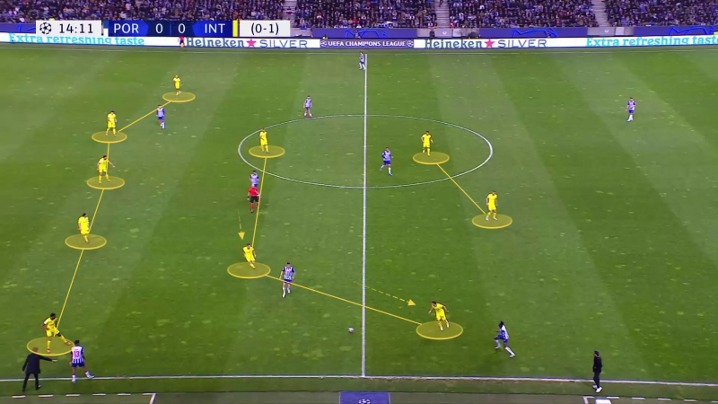 Ici, Porto ressort côté gauche avec Sanusi pendant que Galeno aimante Dumfries. Comme souvent, Barella sort sur le latéral adverse, alors que le 6 – ici Çalhanoğlu – accompagne la phase de pressing.