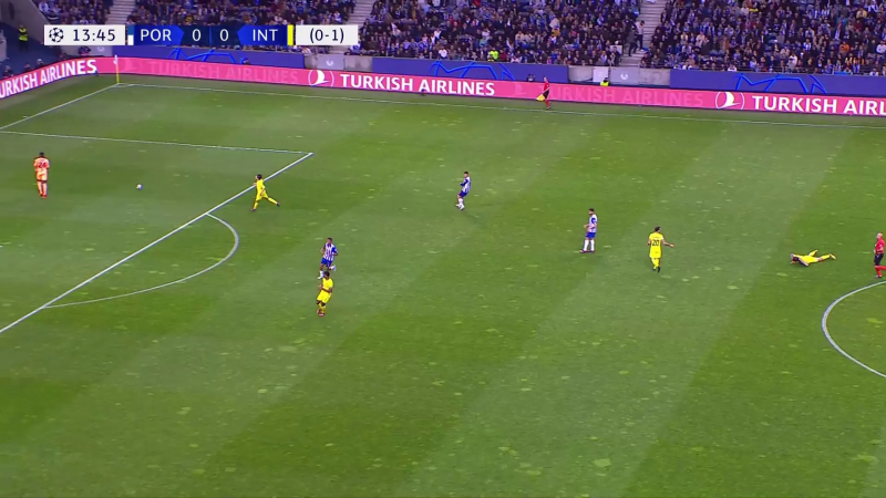 Lors des premières minutes, Porto va tester la vigilance dans la profondeur de la ligne défensive milanaise : Eustaquio décroche, suivi de près par Mkhitaryan, et alerte Evanilson, contrôlé par Bastoni et Acerbi, dans la profondeur. L’Inter va alors tranquillement récupérer le ballon.