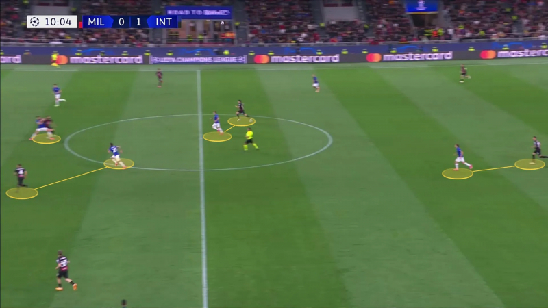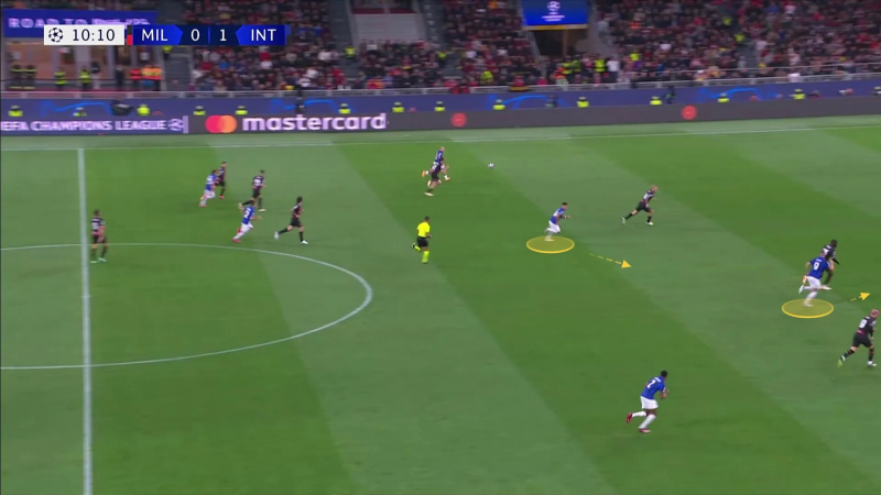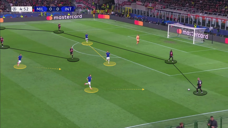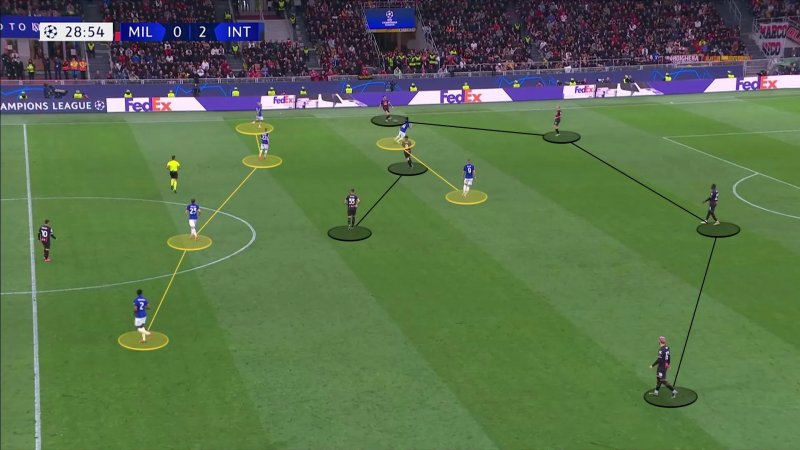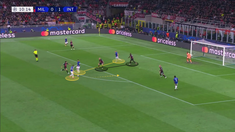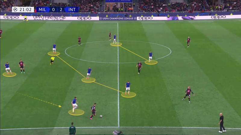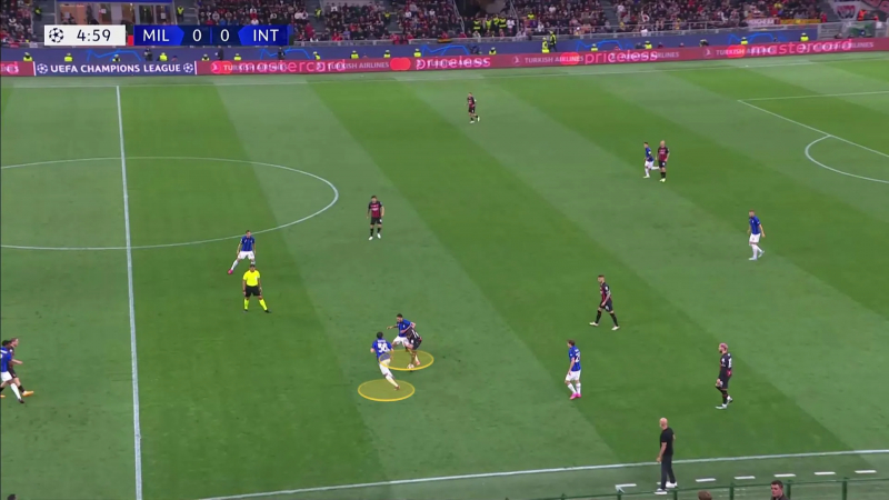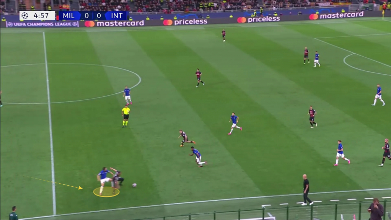 … Acerbi est à la chute et gagne son duel face à Giroud, alors que les trois milieux de l’Inter sont en individuel face aux trois milieux du Milan (Krunic, Bennacer, Tonali)…