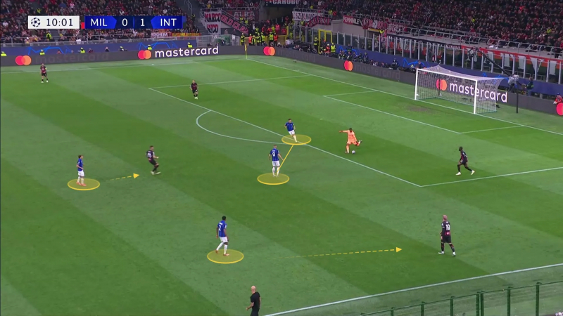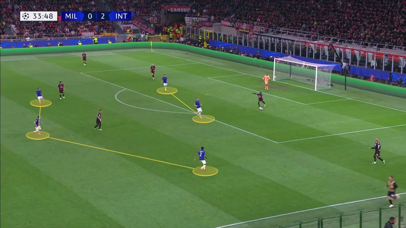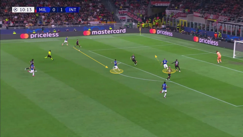 … Džeko reste hors du champ de vision de Tomori et, par son déplacement, empêche la défense du Milan de coulisser. Lautaro sort aussi du champ de vision de Kjaer…