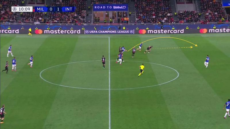 Nouvel exemple ici, ce qui va pousser Tomori à relancer long : Darmian sera ensuite à la retombée.