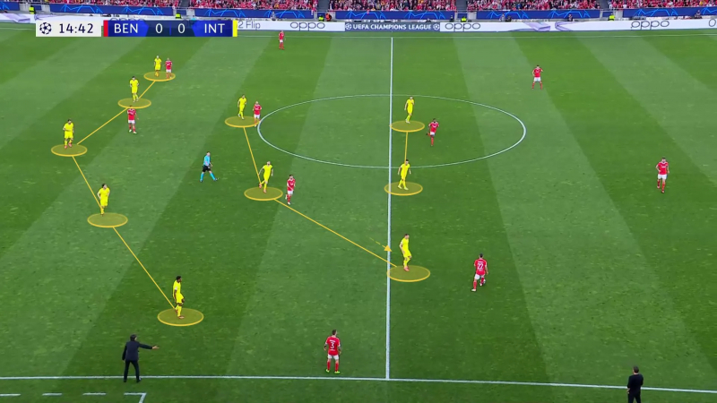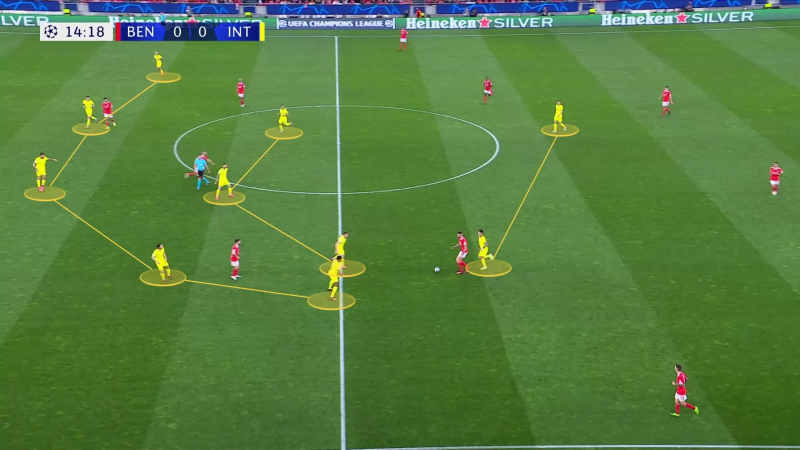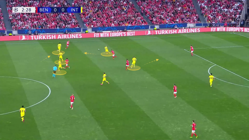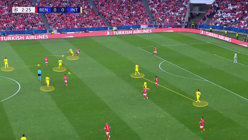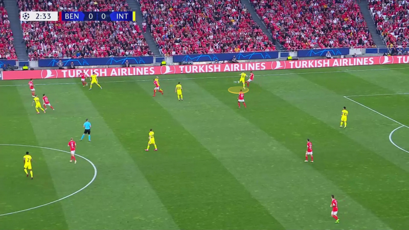 … ou là, quand Benfica construit une nouvelle opportunité, où on retrouve Barella qui vient aider sa première ligne de pression Džeko-Lautaro.