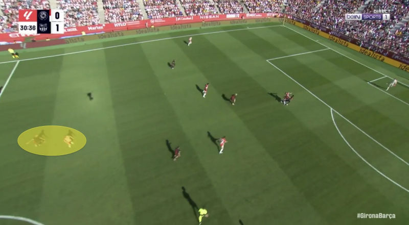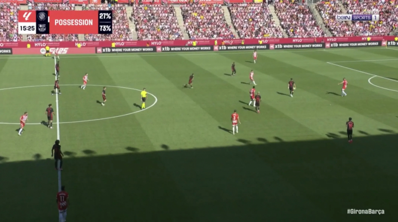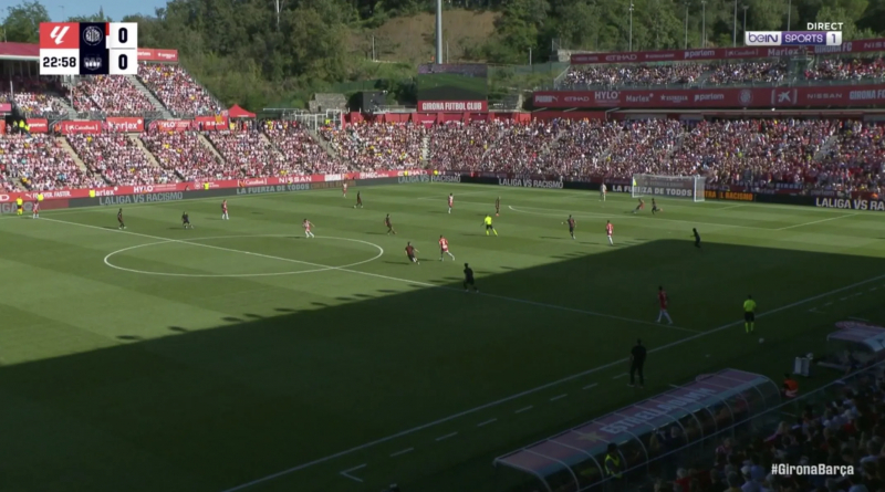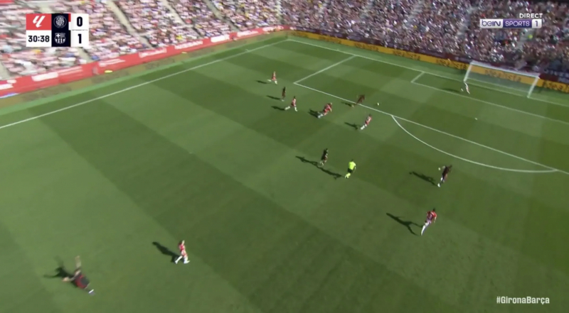 Ce qui saute très vite aux yeux est, déjà, la volonté permanente de ce Barça de ne jamais laisser le ballon respirer. Ce dynamisme n’est permis que par une chose, et c’est toute la clé de l’apport d’Hansi Flick : ce que le FC Barcelone a le plus amélioré en l’espace de quelques semaines est son positionnement. Oui, le Barça court plus, mais il court surtout mieux, plus intelligemment, avec des joueurs qui sont mieux étagés que sous Xavi. Face à Gérone, par exemple, la vitesse de circulation élevée du ballon n’a été rendue possible que grâce au fait qu’aucun élément placé à l’intérieur du jeu (Casadó, Pedri, Olmo, Raphinha, Yamal, selon les séquences) n’évoluait à la même hauteur qu’un autre partenaire. Cela a ouvert des angles favorables de passe et a permis de percer en son cœur le bloc de Michel. C’est sans doute l’autre point le plus bluffant : ce Barça, tenu par les pieds de Ter Stegen, Cubarsí et Martínez, ne sort quasiment le ballon que par l’axe et n’explose sur le côté que dans un second temps, ce qui est facilité par le premier travail de fixation à l’intérieur du bloc adverse et, bien sûr, boosté par le profil des latéraux (Koundé, et surtout Baldé).