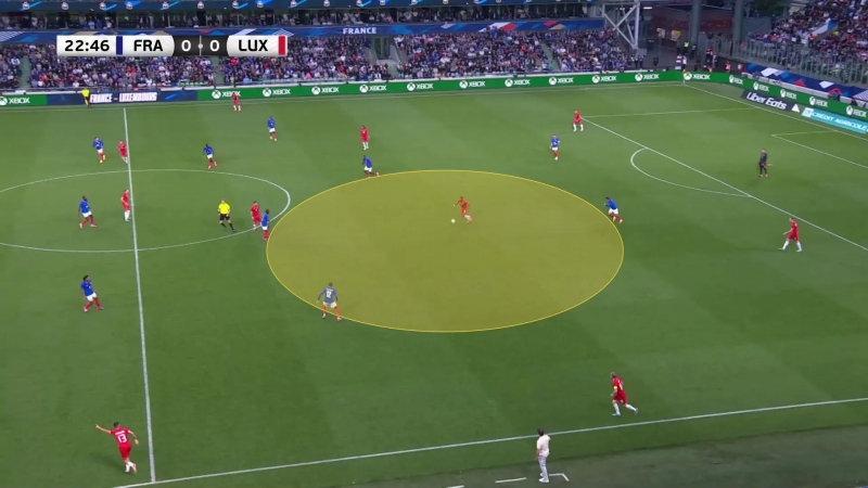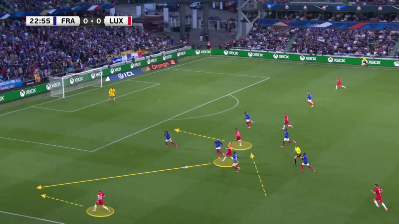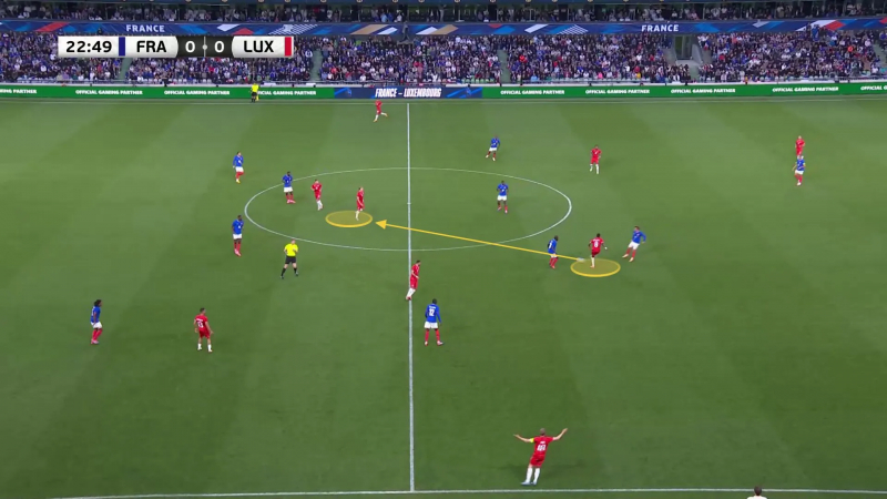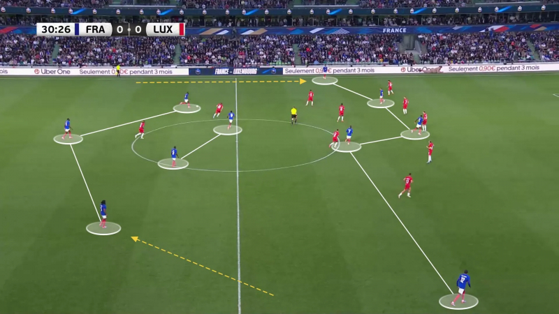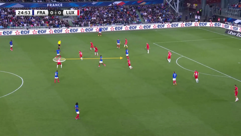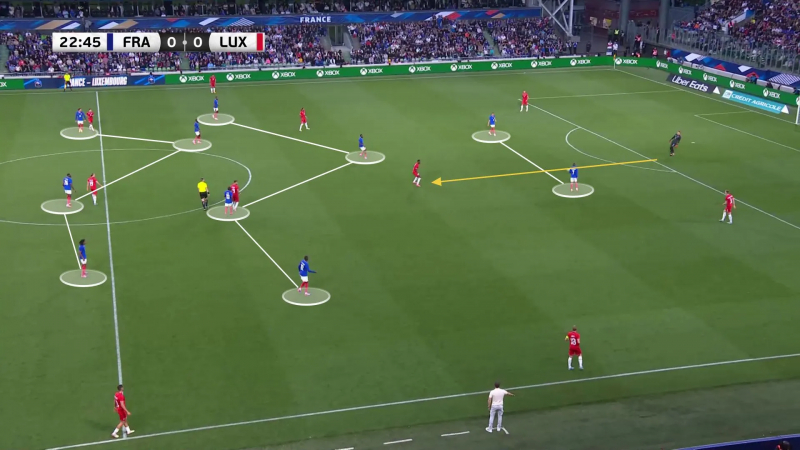 Néanmoins, si le premier match face au Luxembourg a laissé apparaître des mécanismes pour libérer de l’espace à Hernandez (pour un seul petit but tenté par le latéral du Milan) et quelques beaux mouvements intérieurs, Griezmann n’hésitant pas, par moments, à venir surcharger le côté gauche pour générer du chaos dans le bloc adverse, il a également filé quelques petits regrets, notamment lié au manque d’initiative balle au pied des centraux excentrés tricolores. Upamecano, remarqué au Qatar pour sa capacité à faire sauter les lignes adverses, a, par exemple, quasi exclusivement échangé latéralement avec Theo Hernandez (la principale connexion française sur le match) et n’a pratiquement jamais verticalisé le jeu, ce que Konaté a, au contraire, su faire sur quelques situations avec succès.