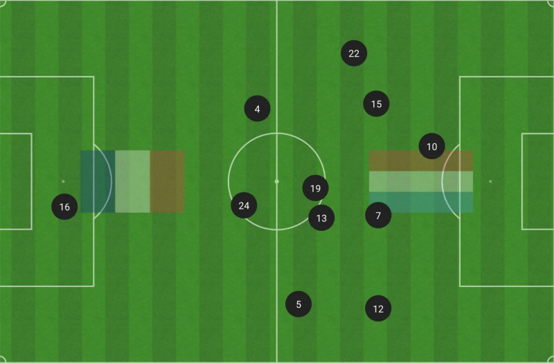 Un exemple de séquence de pressing bancale, où la première ligne de pression française n’est pas assez compacte, où le bloc est trop étendu et où Youssouf Fofana se retrouve dans un entre-deux, laissant alors Christopher Martins seul…