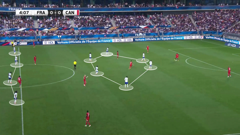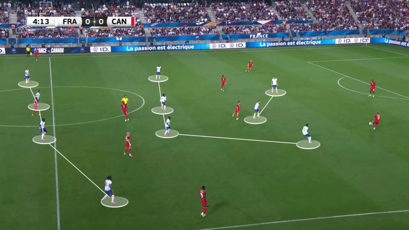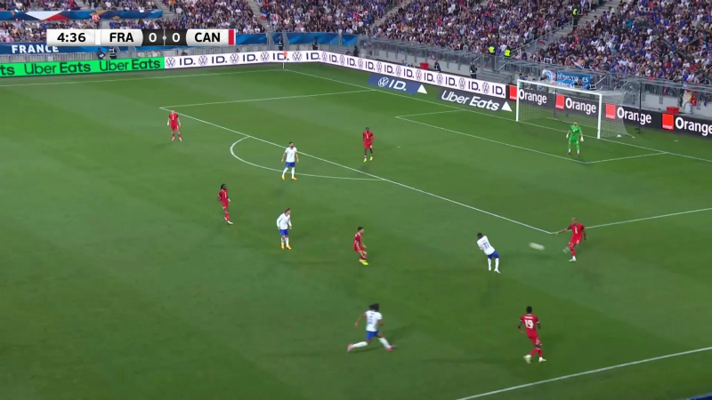 … où Antoine Griezmann et Olivier Giroud ont été connectés, coupant majoritairement l’accès au double pivot canadien et laissant les joueurs excentrés forcer le jeu latéral.
