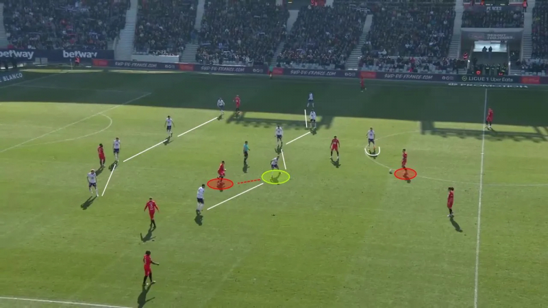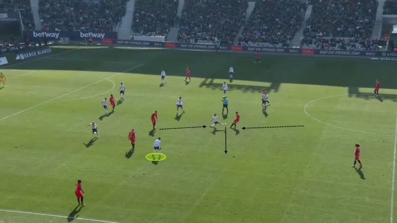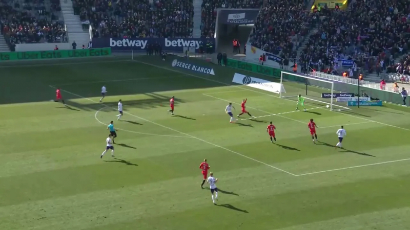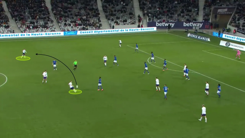 S’il est peu probable que les séquences d’attaques placées se répètent face à la traque des Phocéens affamés, Toulouse est toutefois capable de performer sur ces situations, en témoignent les derniers affrontements face à des équipes supposées plus faibles. Un scénario notamment, répété à de nombreuses reprises, semble majoritairement sortir du lot. Déjà présente en Ligue 2 la saison passée dans une compétition qu’ils ont écrasée techniquement et territorialement, la faculté des Toulousains à combiner sur le côté peut faire des ravages. Grâce à l’apport d’un milieu relayeur du 4-3-3 sur la largeur – Branco van den Boomen le plus souvent côté gauche et Brecht Dejaegere parfois côté droit -, les joueurs du Tef’ s’offrent des supériorités numériques, souvent bien converties par le mouvement de chacun et une occupation des espaces optimale.