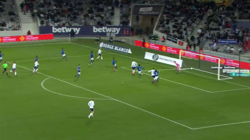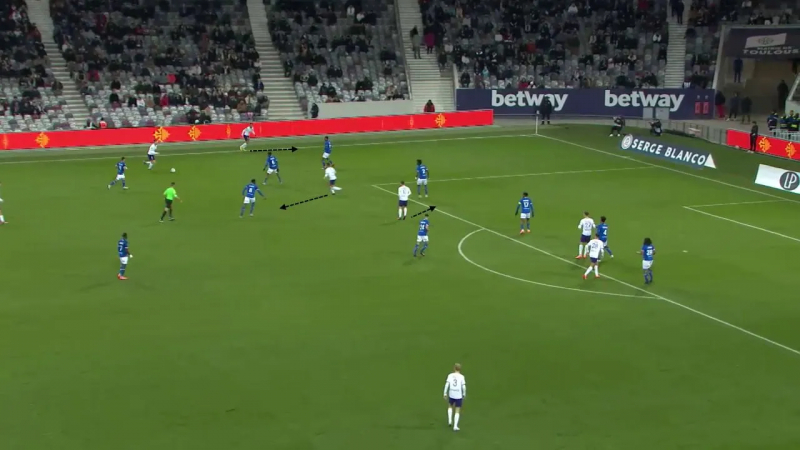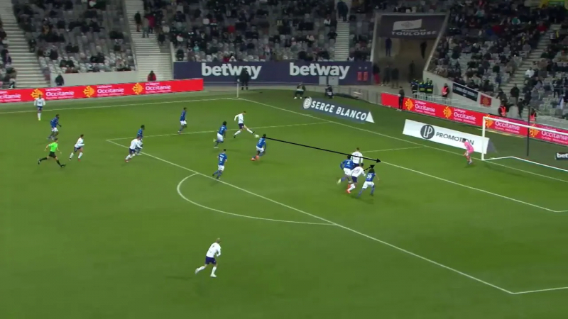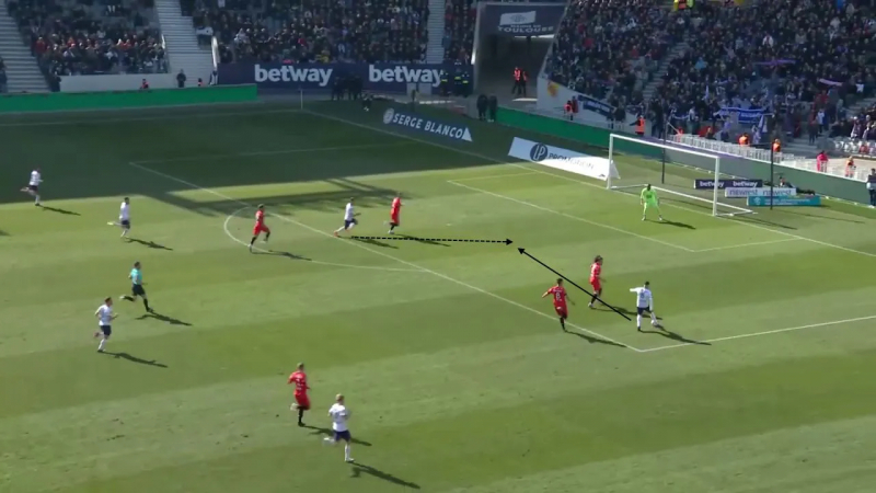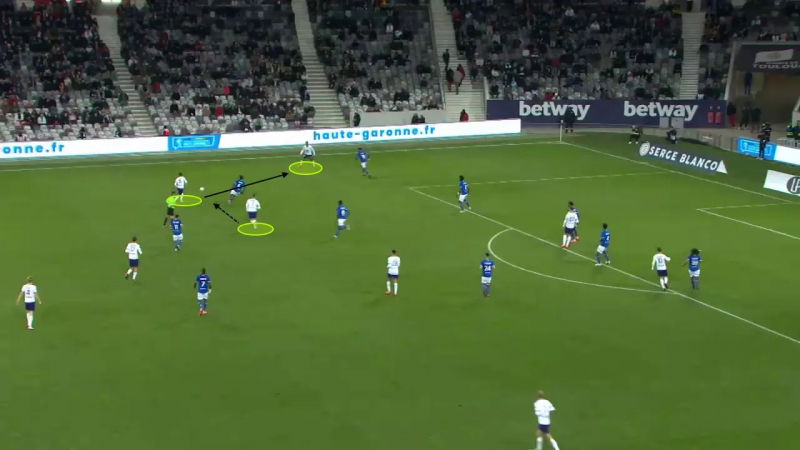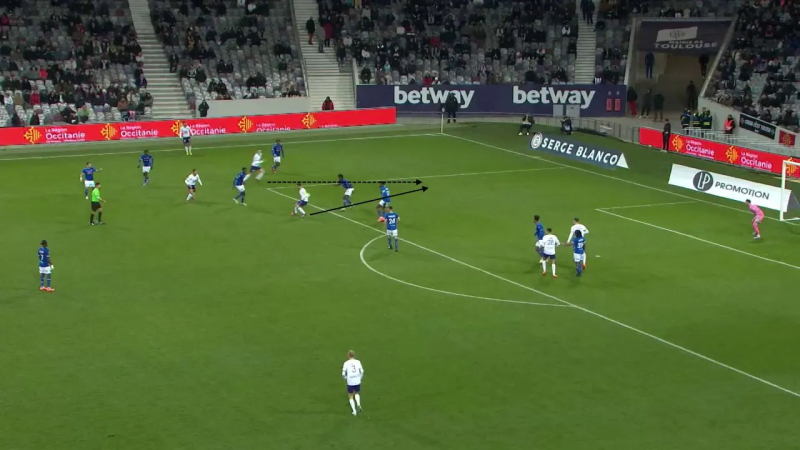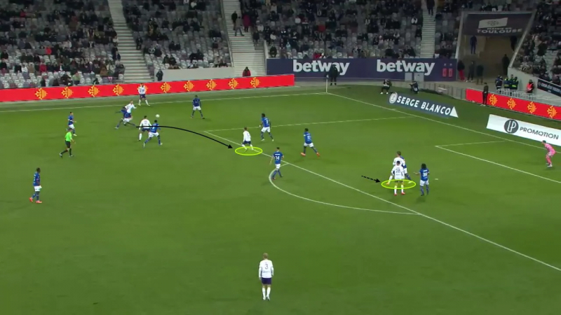 Il se met ensuite dans le sens du but et lance la machine. Il profite, une nouvelle fois, de la bonne coordination toulousaine pour s’ouvrir des portes et des lignes de passes en direction du but…