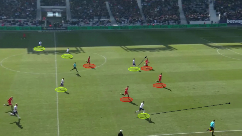 Le Tef’ se projette ensuite en nombre, profitant d’une supériorité numérique, tandis que son ailier marocain s’occupe de faire la différence à la course. Dans le même temps, Dallinga disparaît dans le dos de Joe Rodon…