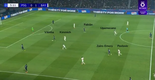 À son avantage pour réguler le tempo de l’équipe et servir de « troisième central » à la relance lorsque cela est nécessaire, le Portugais va trouver Kimmich constamment collé à ses basques. De ce fait, le numéro 17 n’aura que trop rarement le champ nécessaire pour distribuer vers l’avant ou permettre à ses coéquipiers de respirer. Cette configuration avait déjà offert une récupération haute et l’ouverture du score au FC Barcelone, le mois dernier. Même lorsque Vitinha va tenter de se rendre disponible sans ballon avec ses courses en profondeur, impossible de se défaire de son garde du corps. Une situation complexe, à laquelle s’ajoutent les marquages sur Fabián Ruiz et Warren Zaïre-Emery, annulant le surnombre que peut avoir le PSG dans l’axe. Or, puisque le Bayern aligne un double pivot composé de Joshua Kimmich et Aleksandar Pavlović, Vincent Kompany va prendre le risque de faire monter Dayot Upamecano.