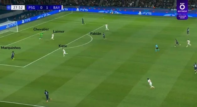 Si ce Paris Saint-Germain porte une grande menace de par la qualité de son milieu de terrain, il ne faut pas non plus occulter les côtés (véritables rampes de lancement pour Nuno Mendes, Bradley Barcola ou encore Khvicha Kvaratskhelia). Puisque les montées d’Upamecano font perdre en présence défensive, les ailiers vont mettre la main à la pâte. Aussi bien Michael Olise, auteur d’une prestation remarquable sur son côté droit, que Luis Díaz (en dépit de son excès d’engagement). Si certaines incursions sont à noter durant ces 45 minutes dans la moitié de jeu bavaroise, le contrôle des courses en profondeur était trop bien huilé pour qu’elles puissent être dangereuses.