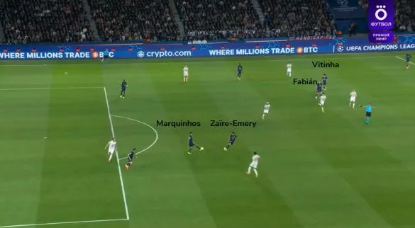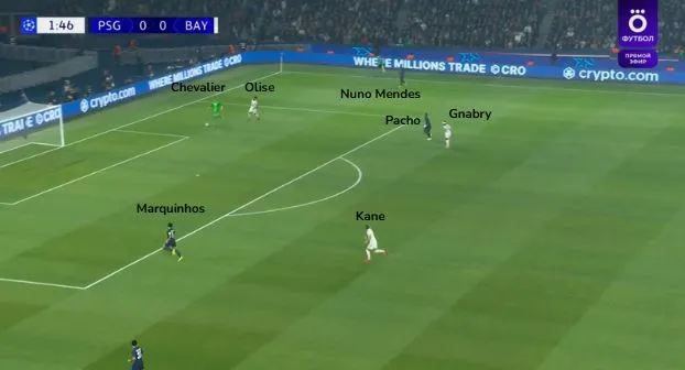 (1/2) À l’origine au pressing sur Nuno Mendes, Michael Olise va continuer son effort en pressant Lucas Chevalier à la relance : les deux défenseurs centraux étant eux aussi pris d’assaut, Marquinhos va sans succès reculer d’une dizaine de mètres afin d’avoir du temps face au jeu et envoyer sa passe en touche.