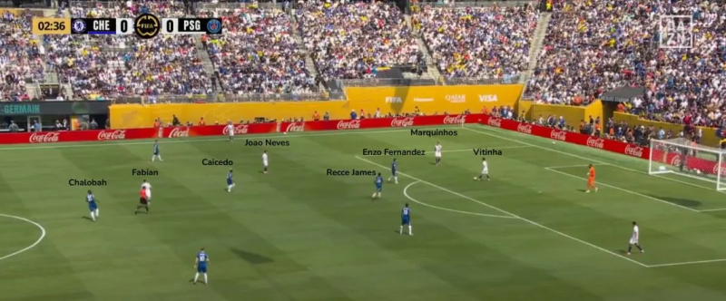 Sans mettre la même intensité que le Bayern, le procédé reste le même : un joueur va se charger de resserrer continuellement Vitinha en phases de possession (ce qui était le rôle d’Enzo Fernandez) tout comme les autres milieux de terrain, et derrière, un défenseur central va monter d’un cran pour annuler le surnombre du milieu de terrain (ici, Trevoh Chalobah).