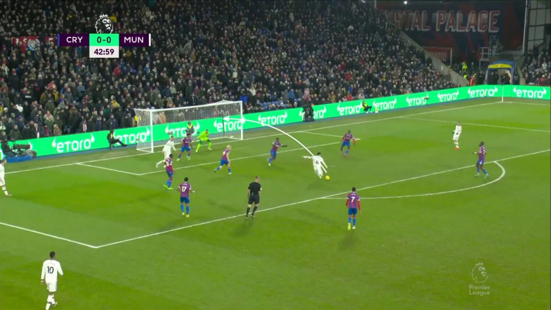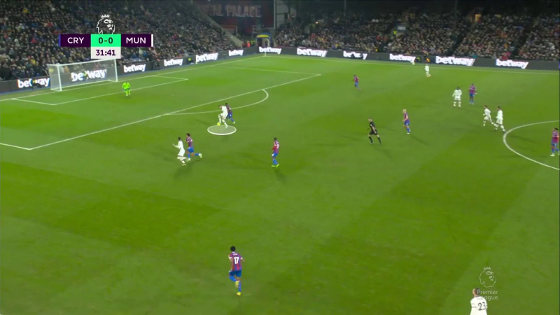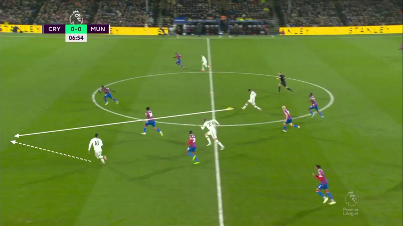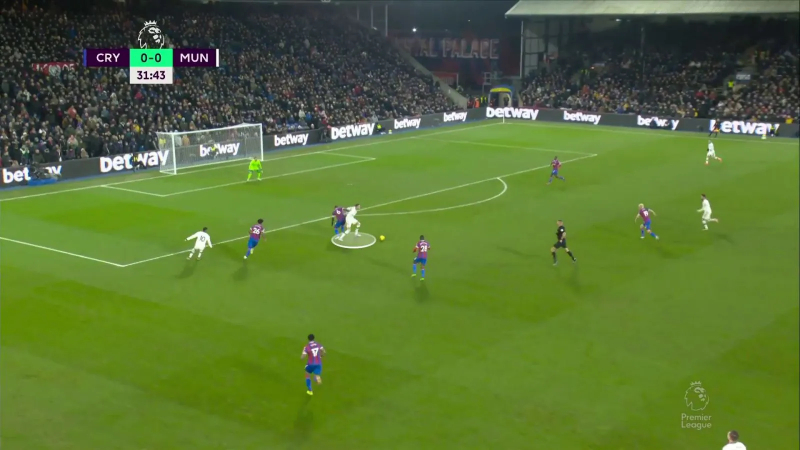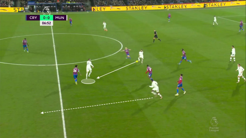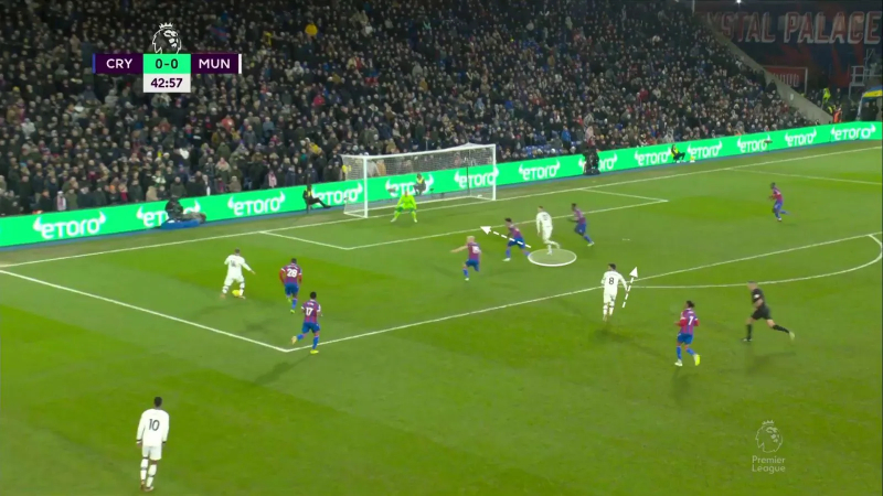 Exemple sur cette situation où, après une récupération d’Eriksen dans son camp, Weghorst va se retrouver impliqué dans un triangle avec Marcus Rashford et Bruno Fernandes. Objectif clair : faire sortir Chris Richards et lancer Rashford dans l’espace grand ouvert.