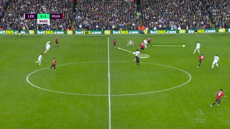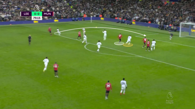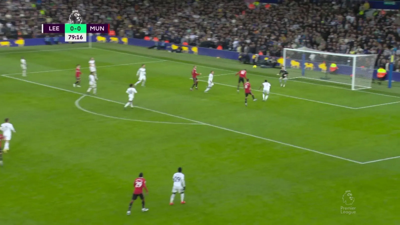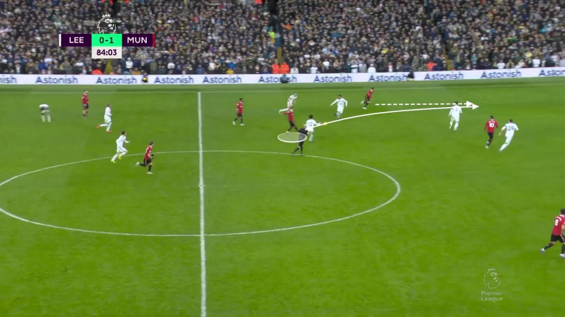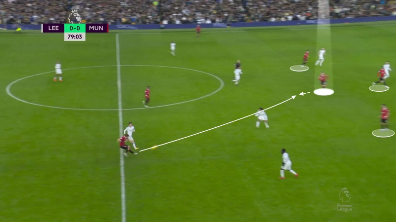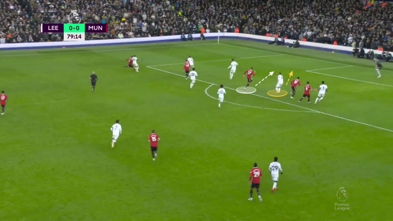 L’animation avec ballon du Manchester United post-heure de jeu à Leeds avec un Sabitzer chargé de décrocher pour générer une supériorité numérique à la relance, trois offensifs – Garnacho, Weghorst, Fernandes – serrés dans les couloirs intérieurs dans le dos du double pivot adverse, et Rashford chargé d’enchaîner les courses pour faire stresser la ligne défensive. Ici, Sabitzer peut trouver Weghorst derrière la deuxième ligne de pression de Leeds.