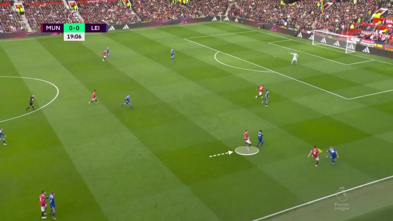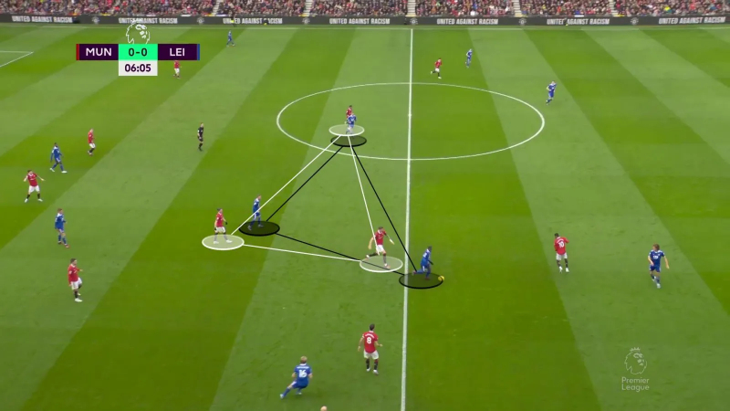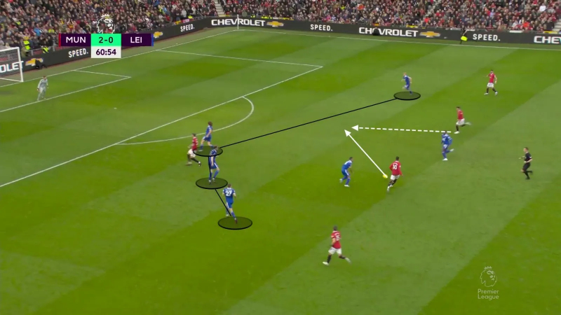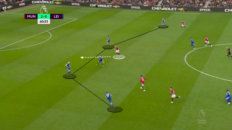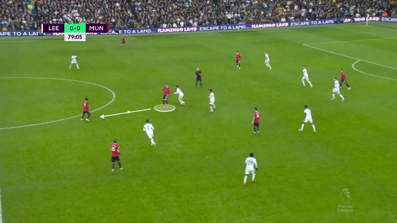 C’est ce qu’on a, par exemple, vu sur cette situation, où Fred, soutenu par Weghorst, tombe sur De Jong et permet ainsi à Bruno Fernandes…