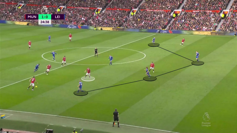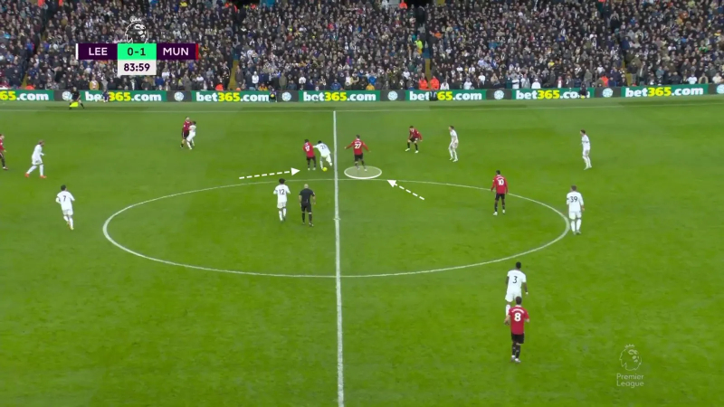 Quelques minutes plus tard, après un long ballon de De Gea, Fred et Weghorst sautent sur Weston McKennie, puis provoquent une récupération à la médiane. La transition peut alors s’enclencher.