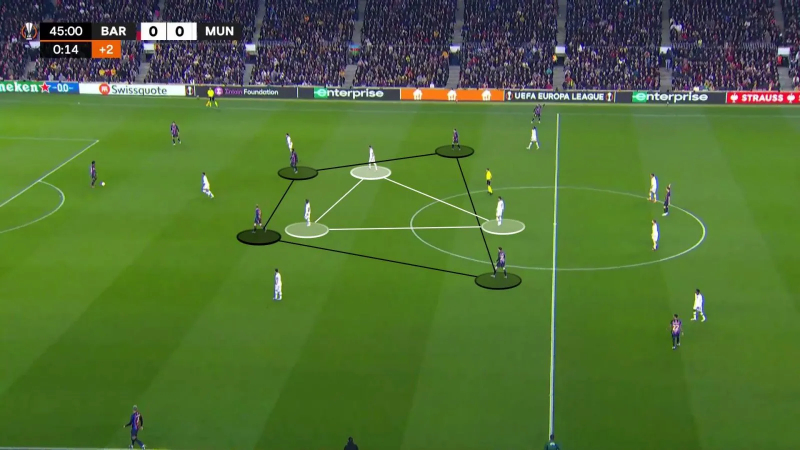 L’organisation sans ballon de Manchester United, jeudi dernier, avec toutes les problématiques évoquées plus haut, mais aussi un quatre-contre-trois à gérer à l’intérieur du jeu. La clé a donc été de faire tomber le Barça dans l’entonnoir, où Weghorst et Fred attendaient De Jong et Kessié, et de piquer en transitions.