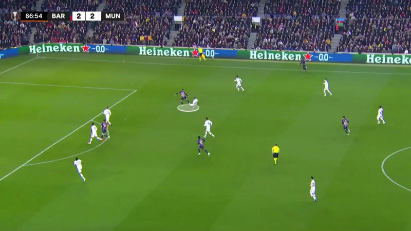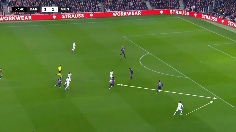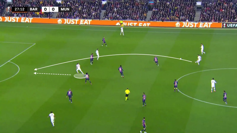 Ce rôle ne l’empêche pas de piquer offensivement, comme ici, après une récupération post-corner de Shaw. Sur cette situation, il va rater son face-à-face avec Ter Stegen.