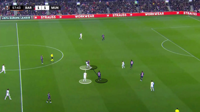 Plus tôt dans la rencontre, on a aussi pu voir l’impact dans les duels au sol de Weghorst. Sur cette situation, Manchester United a également réussi à forcer le Barça à jouer dans l’axe : Weghorst saute alors sur Lewandowski…