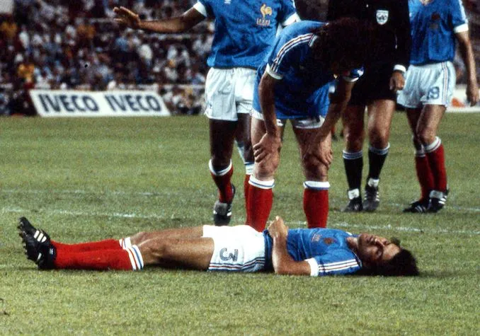 Cela fait plus de trente-cinq ans qu’Harald Schumacher est sorti à toute vitesse de sa cage pour percuter Patrick Battiston. Et la blessure n’est toujours pas refermée. Cette défaite contre l’Allemagne le 8 juillet 1982 à Séville est ressentie comme une immense injustice pour les joueurs français, et pour bon nombre de supporters. Il faut dire que le scénario de ce match est un peu fou. Mais ce qui fait enrager le plus, encore aujourd’hui, la bande à Michel Hidalgo, c’est bel et bien ce qu’il s’est passé à l’heure de jeu. Lancé en profondeur par Michel Platini, Battiston, qui vient d’entrer en jeu, se présente seul face au gardien allemand, sorti à sa rencontre. Sa petite frappe lobée passe de peu à côté, mais Schumacher ne manque pas sa cible, lui. Il cogne Battiston de plein fouet, sans s’occuper du ballon, et lui casse trois dents. Le Français gît sur le sol, quitte la pelouse sur civière, pendant que l’arbitre siffle un six mètres pour l’Allemagne. Insensé.