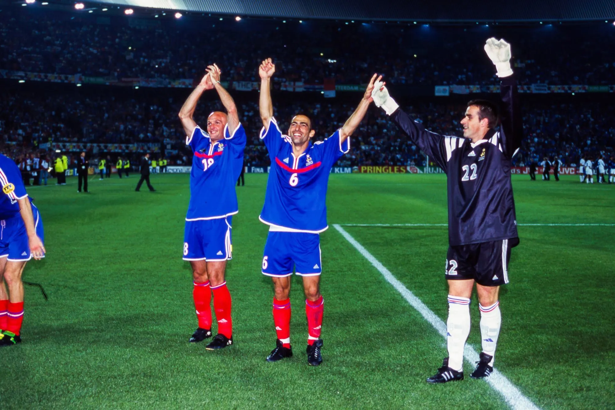 Henry et Trezeguet n’étaient plus les gamins de 1998, de même qu’Anelka qui n’avait pas été retenu pour la Coupe du monde. Sur le papier, cette équipe paraît mieux armée offensivement, mais en regardant les matchs avec du recul, elle semble en revanche souvent coupée en deux : les offensifs ne défendent pas et les défensifs, en dehors de Vieira, peinent dans le jeu de transition. Vous êtes d’accord avec ça ?Non. Il y avait beaucoup de complémentarité. En 2000, vous avez raison de dire que le potentiel offensif était plus consistant qu’en 1998, mais la base défensive était également plus mature. Surtout, il ne faut pas comparer le foot d’aujourd’hui avec celui d’il y a 20 ans. Aujourd’hui, on attaque et on défend tous ensemble, avec un bloc qui s’étale sur pas plus de 35 mètres. Tandis qu’en 2000, on cherchait quasi systématiquement à lancer un attaquant dans la profondeur.