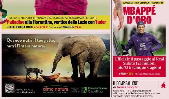 Le meilleur buteur de la Ligue 1 se glisse aussi en Une de la Gazzetta dello Sport. Un « Mbappé d’or » pour le journal transalpin, qui balance directement le chiffre de 125 millions de prime à la signature et note que Carlo Ancelotti a désormais « un Galactique en plus ». De quoi attirer le badaud… mais pas autant que cet encart publicitaire associant un chat et un éléphant pour promouvoir les aliments de la marque Almo Nature, engagée pour la protection des animaux et de la biodiversité. Mbappé pèse lourd dans le monde du football, mais à côté d’un éléphanteau, ça reste un peu léger.