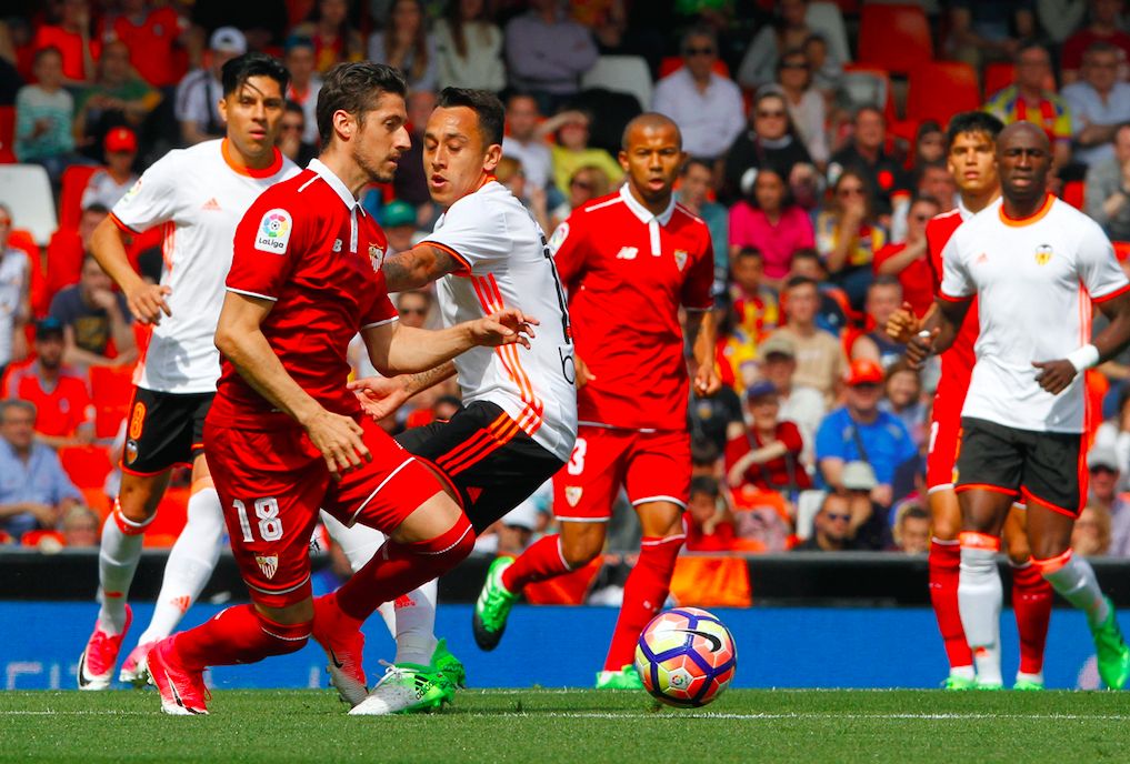 En bagarre avec l’Atlético de Madrid pour la médaille de bronze, le FC Séville se devait de revenir de Valence avec les trois points après la victoire des Colchoneros face à Osasuna (3-0). Pour réussir pareille mission, l’entraîneur andalou, Jorge Sampaoli, confie les commandes offensives de son 4-2-3-1 à Joaquín Correa, laissant Wissam Ben Yedder sur le banc. Le FC Séville galère à déployer son jeu face à des Valenciens au sourire retrouvé depuis l’installation permanente de Voro sur le banc. Insouciants, les coéquipiers d’Eliaquim Mangala s’amusent à courir dans tous les sens pour empêcher les relances adverses.