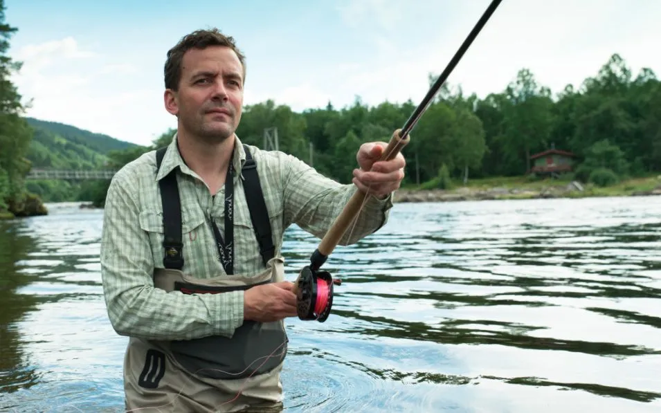 Salut Vegard. Alors, il ne fait pas trop froid à Aunan Lodge début novembre ?Je n’y suis pas, je suis à mon bureau de Trondheim. C’est seulement ouvert l’été, en juin, juillet et août. L’hiver, tu peux seulement pêcher en mer. Mais il fait froid, c’est glacé, donc pas très plaisant. J’aime pêcher en mer, mais tu y vas plus pour attraper de quoi manger. Même si de la morue pêchée en mer, c’est fantastique au dîner. Ce que j’aime, c’est le sport, la communion avec la nature. Je préfère amplement pêcher en rivière : l’eau qui coule, toute l’esthétique de la pêche à la mouche, chasser le poisson dans la rivière. Puis le saumon de l’Atlantique est un poisson culte. Le roi des poissons. C’est un combattant puissant, qui fait resurgir des instincts vraiment anciens en toi.