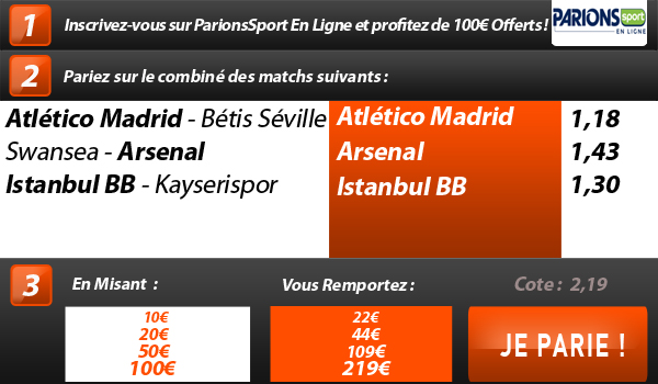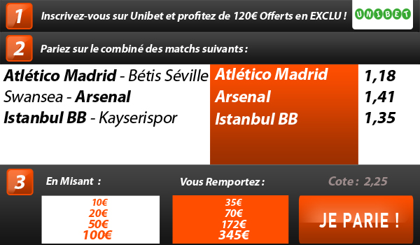 Si vous misez sur les victoires de l’Atlético Madrid, d’Arsenal et d’Istanbul BB dans un combiné, la cote atteindra 2,25 chez Unibet et 2,19 chez ParionsSport En Ligne.