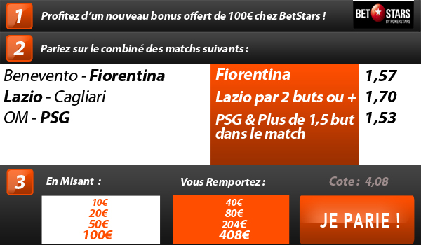 Si vous misez sur les victoires du PSG, de la Lazio et de la Fiorentina dans un pari combiné, la cote atteindra : 4,08 chez BetStars qui offre un nouveau bonus de 100€ !!!