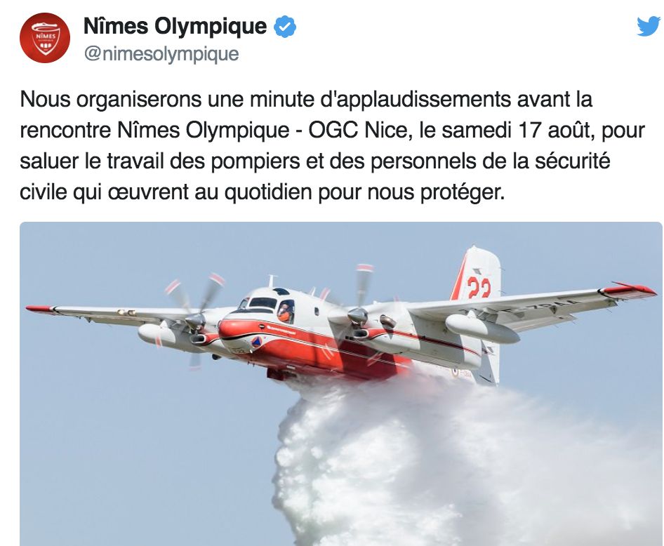 Nous organiserons une minute d’applaudissements avant la rencontre Nîmes Olympique – OGC Nice, le samedi 17 août, pour saluer le travail des pompiers et des personnels de la sécurité civile qui œuvrent au quotidien pour nous protéger. pic.twitter.com/hlUp3iopnu