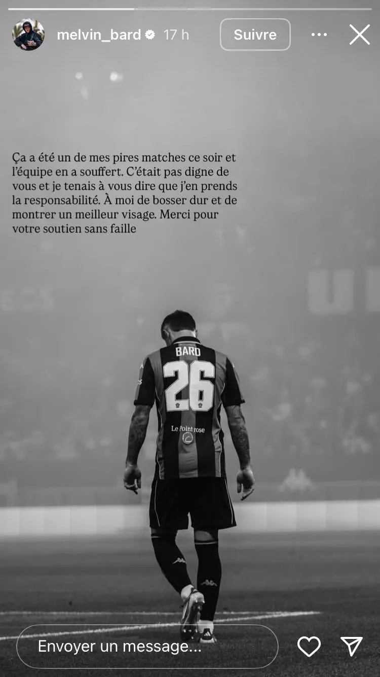 Une nouvelle fois défait en Ligue Europa ce jeudi soir (face à Fribourg 1-3), l’OGC Nice continue de s’enfoncer. Avant-derniers au classement de la C3, les Aiglons ont livré une performance calamiteuse devant leurs supporters. Auteur d’une bévue sur le but de l’égalisation, Melvin Bard a tenu à s’excuser publiquement, une action devenue récurrente chez les joueurs de foot, sans doute pour limiter au maximum la valse de critiques après un mauvais match.