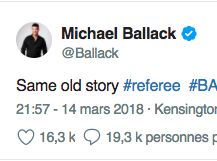 Un ancien de la maison, l’Allemand Michael Ballack, a lui aussi dénoncé cette « injustice » sur Twitter, en faisant référence à l’arbitrage du 6 mai 2009 de Tony Ovrebo lors d’un Chelsea-Barcelone qui avait déjà tourné en faveur des Barcelonais en écrivant : « C’est toujours la même histoire. »