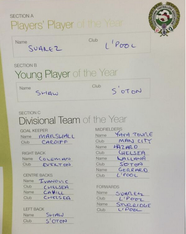 La notion de secret est visiblement sujette à interprétation pour le gardien de West Bromwich Albion, Ben Foster. Il a en effet fait profiter ses followers sur Twitter de ses propres choix. Pour le portier du futur ex-club d’Anelka, Luis Suárez est désigné comme le meilleur joueur de l’année et Luke Shaw comme meilleur jeune.