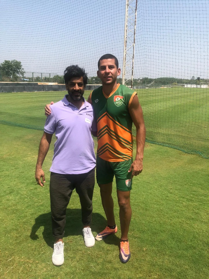 Le docteur Supriya Lolayecar est coordinatrice générale de l’école internationale Sreenidhi. En l’occurrence, c’est elle qui, tout de LVMH vêtue, nous fait visiter la Duccan Académie : « Les fils du docteur Mahhe sont des fans de foot, alors il a créé ce club il y a trois ans. » Mahhe est notamment à l’origine d’une des écoles privées les plus prestigieuses du Sud de l’Inde, avec une forte prévalence du sport dans le cursus. Selon Supriya Lolayecar, « l’école Sreenidhi place le sport au même niveau que l’éducation scolaire. Nous formons de bons élèves, mais aussi des champions. » La salle des trophées est en effet impressionnante. Plus loin, Vikash et moi évoluons sur un terrain en herbe naturelle semblable à un green de golf. Il s’agit du terrain d’entraînement du Deccan FC, un club de foot qui vient de terminer le championnat de ligue 2 à la 2e place, non qualificative pour monter en Premier League. Selon le coach d’origine portugaise Carlos Vaz Pinto, la principale raison de la faiblesse du foot indien est la durée du championnat : « Nous ne jouons que 22 matchs sur l’année quand les championnats en Europe durent deux fois plus longtemps, sans parler des coupes. Impossible de bien former des joueurs avec si peu de matchs. » Le championnat dure de novembre à mai. Après, c’est la mousson. L’entraîneur Vaz Pinto est adepte du tiki taka. « Ici, ils ne connaissent pas », me glisse-t-il dans un sourire. Mais il a un autre petit secret. Le terrain officiel, tout neuf, est synthétique. Quand les équipes du Nord venaient y jouer en plein milieu de journée, la température du terrain montait à 45 degrés. « J’ai demandé à ne pas en changer », conclut l’entraîneur. Le capitaine de l’équipe, David Castaneda Munoz (sur la photo-ci-dessous), un Colombien de 28 ans, gagne 5000 dollars par mois. Un autre, Congolais, gagne 2000 euros par mois. Il y a quatre joueurs étrangers dans l’équipe. Le Colombien est le meilleur buteur du championnat avec 15 buts en 20 matchs joués. En trois ans, la progression du Deccan FC est spectaculaire. Docteur Mahhe a bien travaillé. Ça lui coûte 1,5 million de dollars par an. Ses fils viennent parfois voir les matchs. À demain.