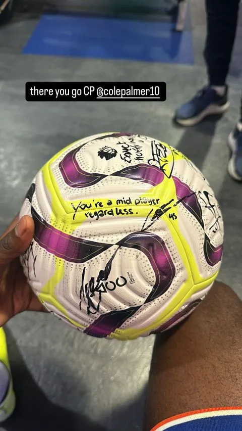 Auteur d’un incroyable quadruplé en 20 minutes, samedi contre Brighton, Cole Palmer continue de forger sa légende en Angleterre. Tout le monde se pâme devant le jeune offensif anglais, sauf son coéquipier Roméo Lavia. Comme le veut la tradition à chaque triplé (ou plus) en Premier League, Palmer a récupéré son ballon du match et l’a fait dédicacer par l’ensemble de ses coéquipiers. « Tu es quand même un joueur moyen », s’est permis d’écrire l’international belge sur le cuir.