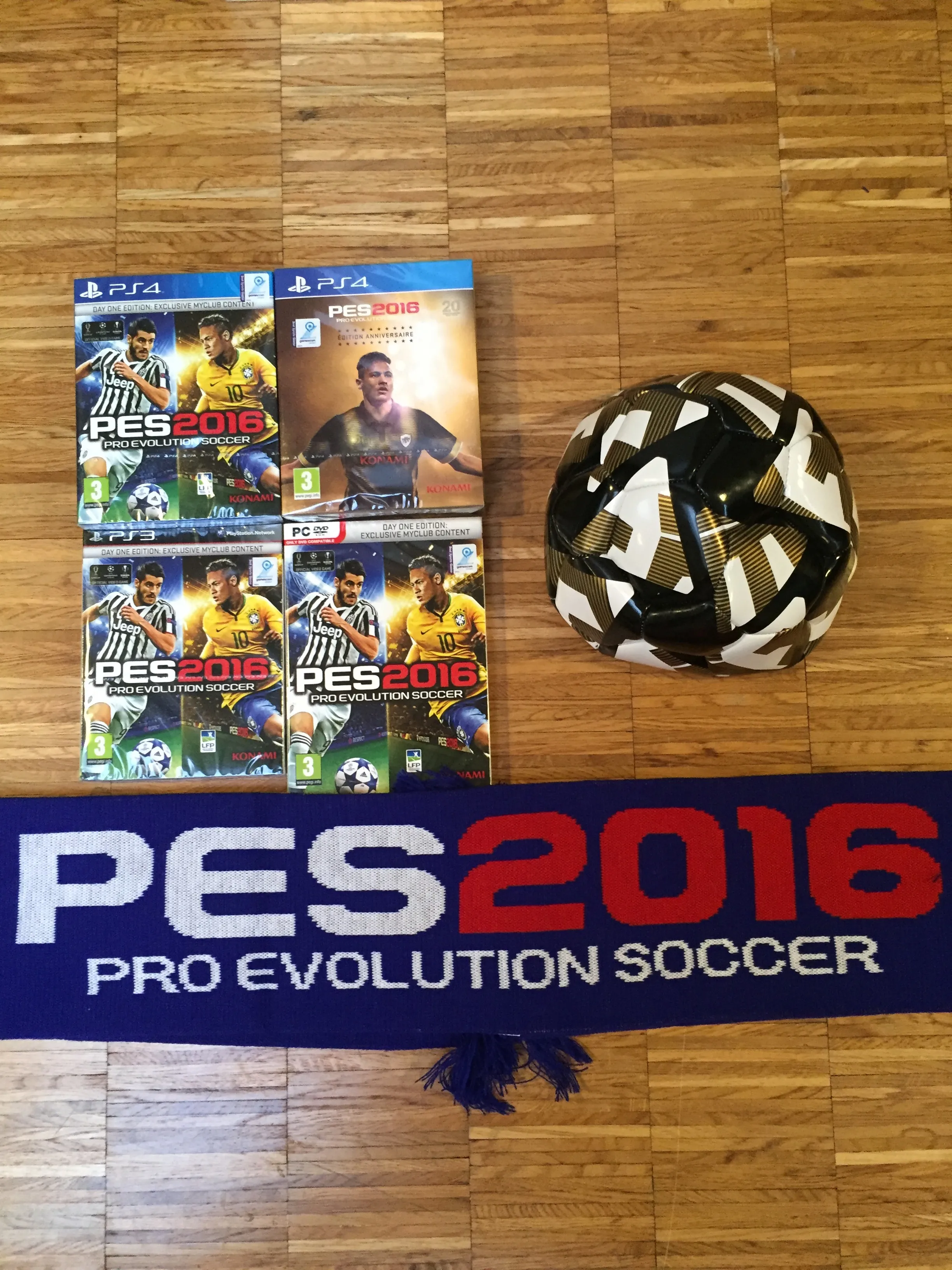 À gagner 5 lots PES avec 1 jeu PES 2016 + 1 écharpe + 1 ballon + 1 T-shirt.