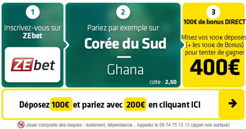 ► 1. Le pari « Victoire Corée du Sud » est coté à 2,50 chez ZEbet qui vous offre 100€ DIRECT (Déposez 100€ et misez avec 200€) en EXCLU avec le code SOFOOTX2 ► Profitez de 100€ offerts DIRECT chez ZEbet :- Inscrivez-vous en cliquant ici. – Rentrez bien le code SOFOOTX2 lors de votre inscription- ZEbet vous offre le montant de votre 1er dépôt jusqu’à 100€. – Déposez par exemple 100€ et misez avec 200€ !- Misez par exemple vos 100€ déposés (+ les 100€ offerts) sur ce pari et tentez de gagner 400€ (500€ – les 100€ de paris gratuits retirés après le pari).