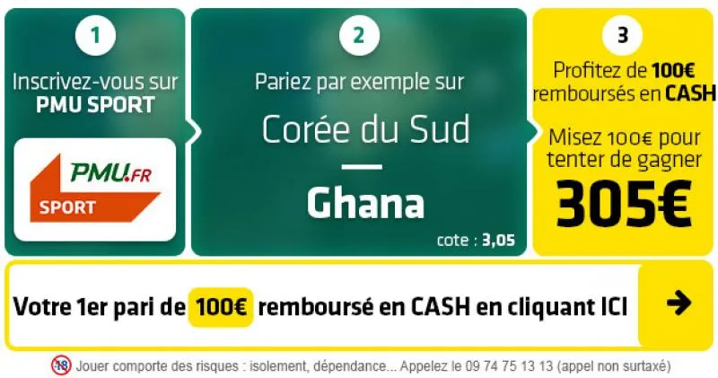 ► 2. Le pari « Victoire Ghana » est coté à 3,05 chez PMU Sport qui vous offre pendant quelques semaines seulement votre 1er pari de 100€ remboursé EN CASH