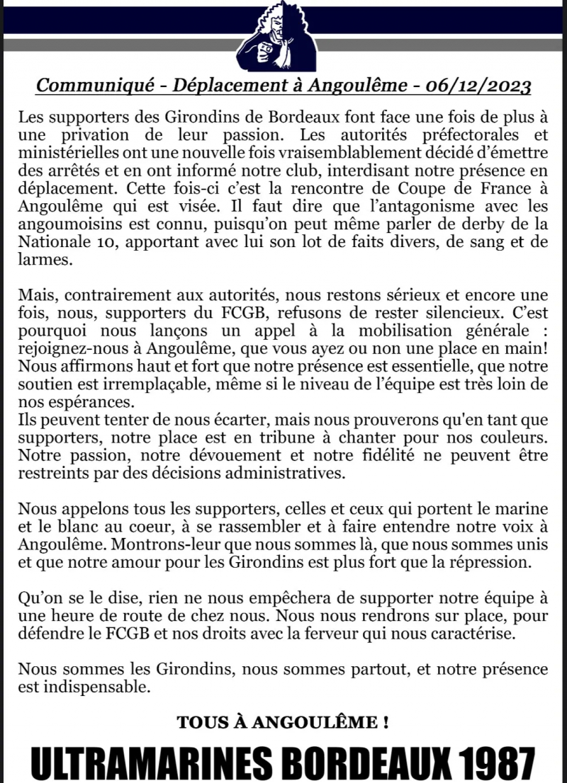 Il faut dire qu’après le décès d’un supporter nantais samedi dernier en marge de la réception de Nice, il devrait continuer de pleuvoir des interdictions de déplacement pour les supporters français, après les déclarations de la ministre des Sports Amélie Oudéa-Castéra et du président de la LFP Vincent Labrune allant dans ce sens. En contestation, les Ultramarines répliquent : « Qu’on se le dise, rien ne nous empêchera de supporter notre équipe à une heure de route de chez nous. Nous nous rendrons sur place pour défendre le FCGB et nos droits avec la ferveur qui nous caractérise. » Ils invitent également les autres supporters bordelais à les imiter.