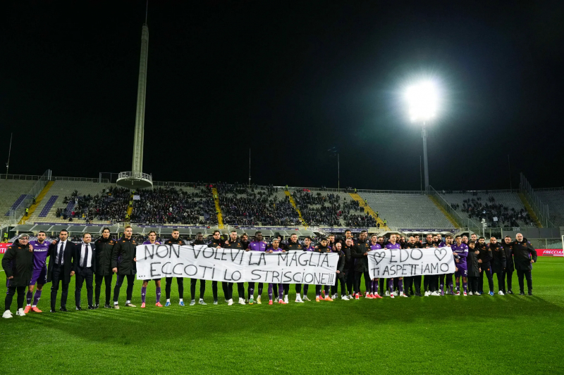 💜 Avant le match de Coupe d’Italie contre Empoli, le public de la Fiorentina a tenu à exprimer son soutien au numéro 4, Edoardo Bove, suite à son malaise survenu en plein match.