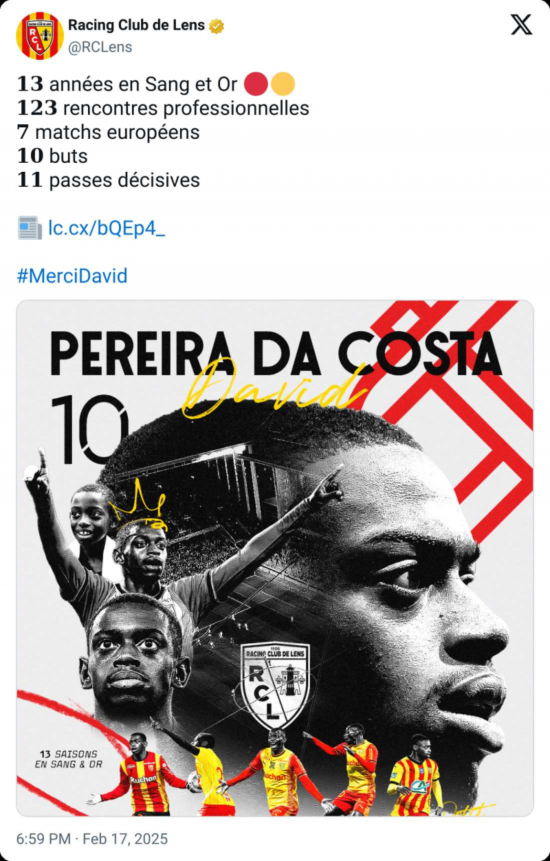 Pereira da Costa s’en va après 123 matchs officiels, dont 7 rencontres européennes, 10 buts et 11 passes décisives. Il avait été l’un des artisans de la très bonne saison lensoise en 2022-2023 qui avait été récompensée par une deuxième place de Ligue 1 et une qualification historique en Ligue des champions. En 2023, il avait manqué une dizaine de matchs après plusieurs blessures successives, mais était resté l’un des hommes forts de Franck Haise.