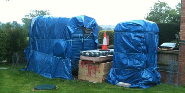 La production exposée comprenait un carillon, une poupée éclatée recouverte de préservatifs en gélatine et un W.C portable couvert de graffitis. Une « horreur » selon ses voisins, qui l’ont obligé hier soir à la recouvrir de bâches.