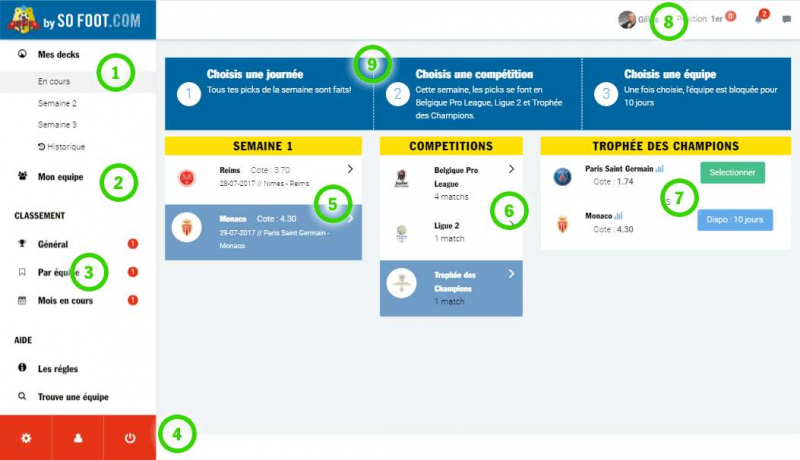 Divers8 Position actuelle dans le classement général (la petite bulle indique la progression dans le classement par rapport à la journée précédente). Zone de notifications.9 Avancement dans le processus de sélection d’une équipe.
