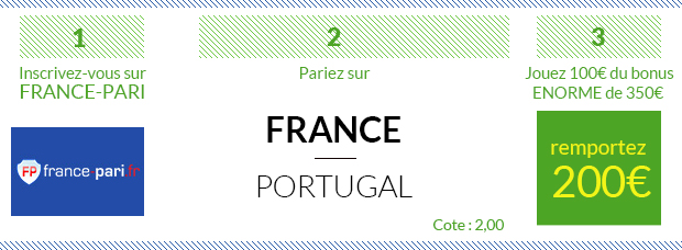 Jusqu’à la fin de l’Euro 2016 seulement, France-Pari vous offre un Bonus ÉNORME de 350€ qui se divise en trois parties : ► un premier pari remboursé de 100€► 150€ de mises remboursés sur les paris suivants